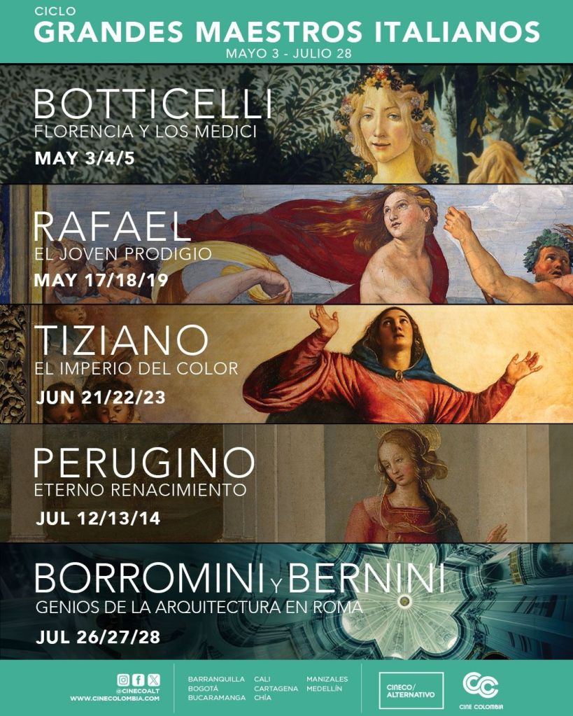 Entre mayo y julio, los espectadores colombianos podrán conocer más sobre los artistas que han marcado un hito en la historia del arte mundial. El ciclo empieza con “Botticelli, Florencia y Los Medici”, que se proyectará el 3, 4 y 5 de mayo. Continúa con “Rafael, el joven prodigio”, el 17, 18 y 19 de mayo. Después, “Tiziano, el imperio del color”, el 21, 22 y 23 de junio. Luego viene “Perugino: Eterno Renacimiento”, el 12, 13 y 14 de julio. Y cierra con broche de oro con “Borromini y Bernini, genios de la arquitectura en Roma”, el 26, 27 y 28 de julio.
